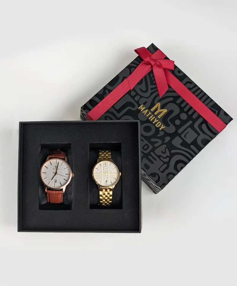 Le coffret propose notre signature unique de montre Linguère deluxe. Assis sur le trône avec notre montre Damel dédiée aux hommes qui ont l’état d’esprit du conquérant. Cette boîte est destinée aux couples de haut rang de la société. Ceux qui cherchent à être un couple puissant et qui cherchent non seulement à vivre l’amour.